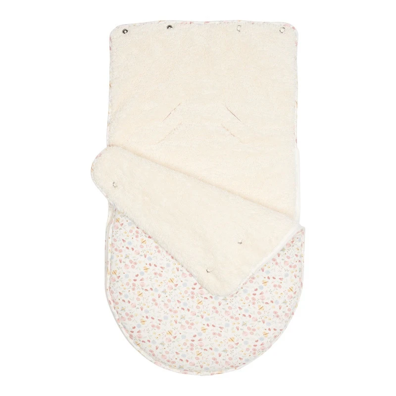 Confortablement rembourrée, la chancelière Flowers & Butterflies de Little Dutch est réalisée en coton imprimé, certifié Oeko-Tex®, et elle est doublée d’un tissu-peluche ultra doux. Elle dispose de fentes laissant passer les ceintures au plus près du corps de bébé, et peut ainsi être utilisée dans le « cosi », la nacelle ou la poussette.