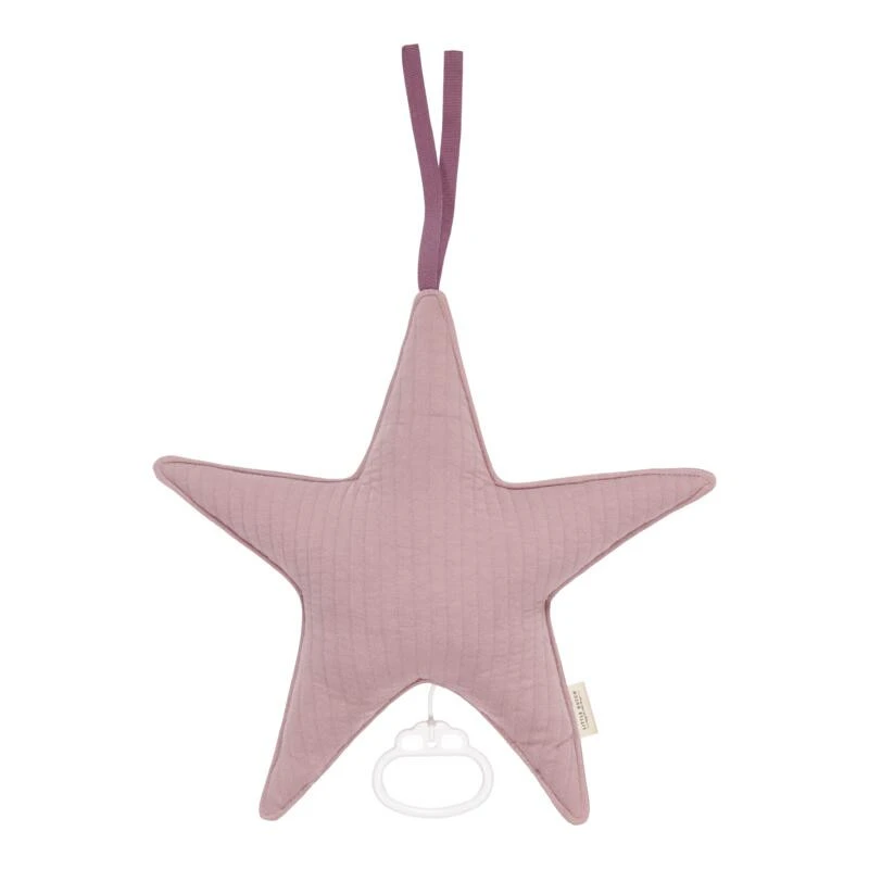 La boîte à musique Pure mauve de Little Dutch dispose de liens pour s’accrocher au bord du lit, au-dessus de la table à langer, sur la nacelle ou le siège-auto, et elle est équipée d’une poignée sur laquelle tirer pour faire entendre les notes de la berceuse « Somewhere over the Rainbow ».