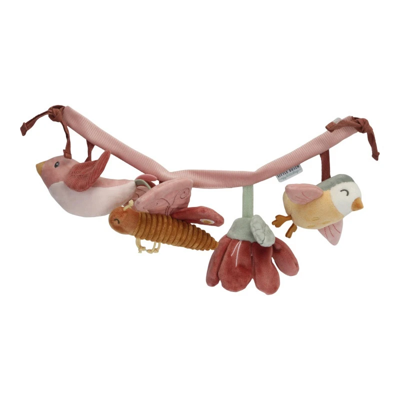 Ce jouet d’activités Flowers & Butterflies de Little Dutch regroupe 4 ravissants sujets suspendus à un ruban en tissu, terminé à chaque extrémité par une nouette. Il peut ainsi facilement s’accrocher à la capote de votre poussette, à l’anse de votre cosi, sur l’arche de votre transat… En promenade ou à la maison, votre enfant peut alors s’amuser avec les deux oiseaux, le papillon ou la fleur, et découvrir les différents jeux qu’ils dissimulent : miroir, hochet, papier froissé, pouêt-pouêt, textures variées…