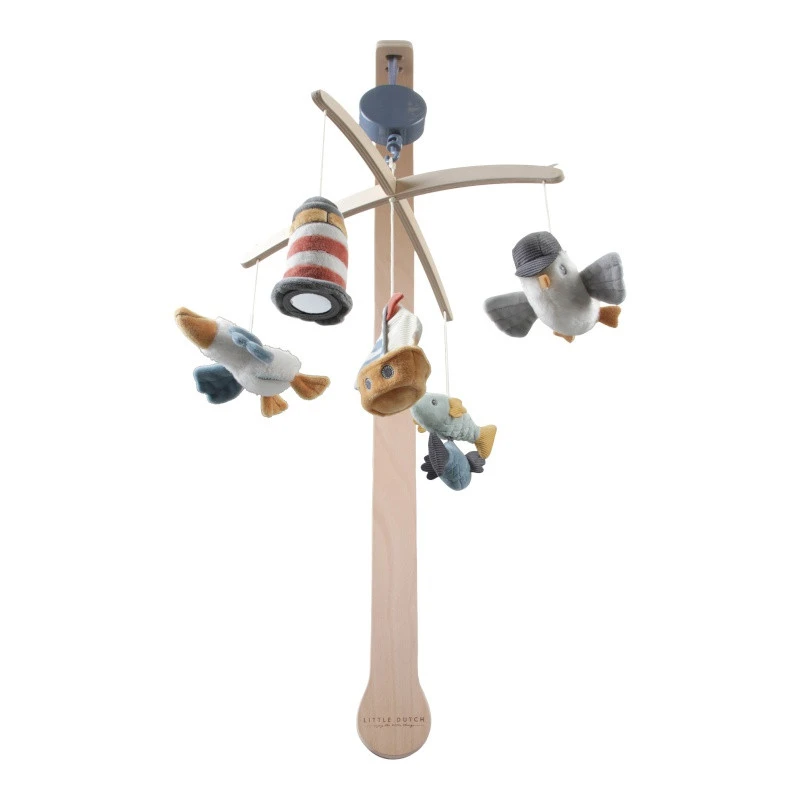 Imaginez de beaux bateaux partis pêcher au large, regagnant la côte guidés par le phare et escortés par de gracieuses mouettes… Cette sympathique ambiance portuaire et les histoires de marins qui vont avec ont inspiré la marque Little Dutch, qui en a fait une superbe collection au nom évocateur : Sailors Bay. Cette gamme est composée de douces peluches et de ravissants jouets d’éveil, dont ce mobile musical magnifique qui favorise l’endormissement paisible de votre nourrisson.