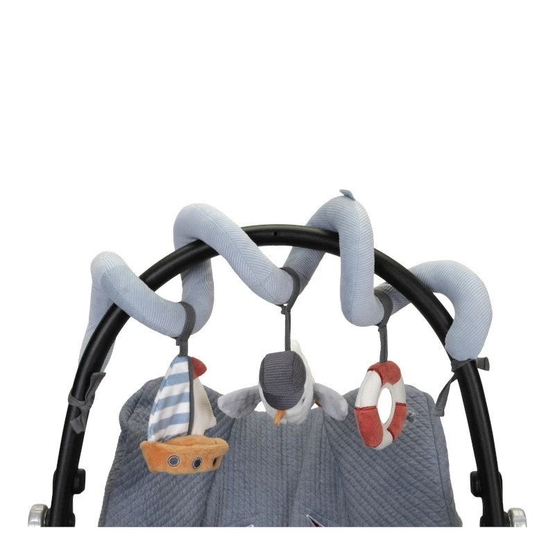 Avec sa forme particulière de ressort et ses liens à chaque extrémité, la spirale Sailors Bay peut s’accrocher partout : au bord du lit, du parc, sur l’anse du cosi ou de la nacelle, sur une arche de transat ou l’arceau de maintien de la poussette. Elle propose alors à votre jeune enfant 3 peluches suspendues, un beau voilier, une élégante mouette et une bouée de sauvetage, qui cachent différentes activités d’éveil telles qu’un miroir, un hochet, des textures différentes, des couleurs contrastées, des étiquettes et petits nœuds…